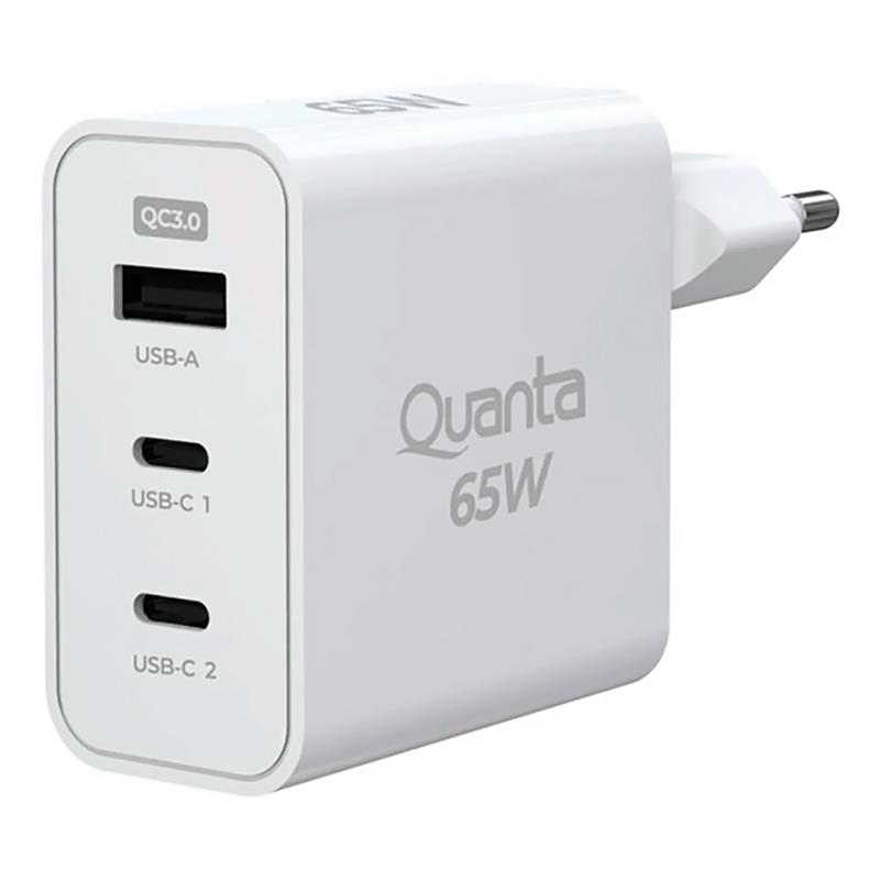FONTE CARREGADOR QUANTA PRO CARGA RAPIDA 2 USBC E 1 USBA 65W QTCRP65 BRANCO